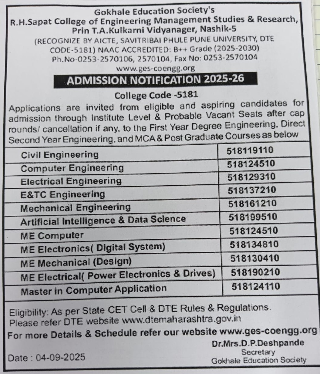 *New Vacant seats after last date of reporting for Direct Second Year Engineering / Technology 2025-2026 – Click here
